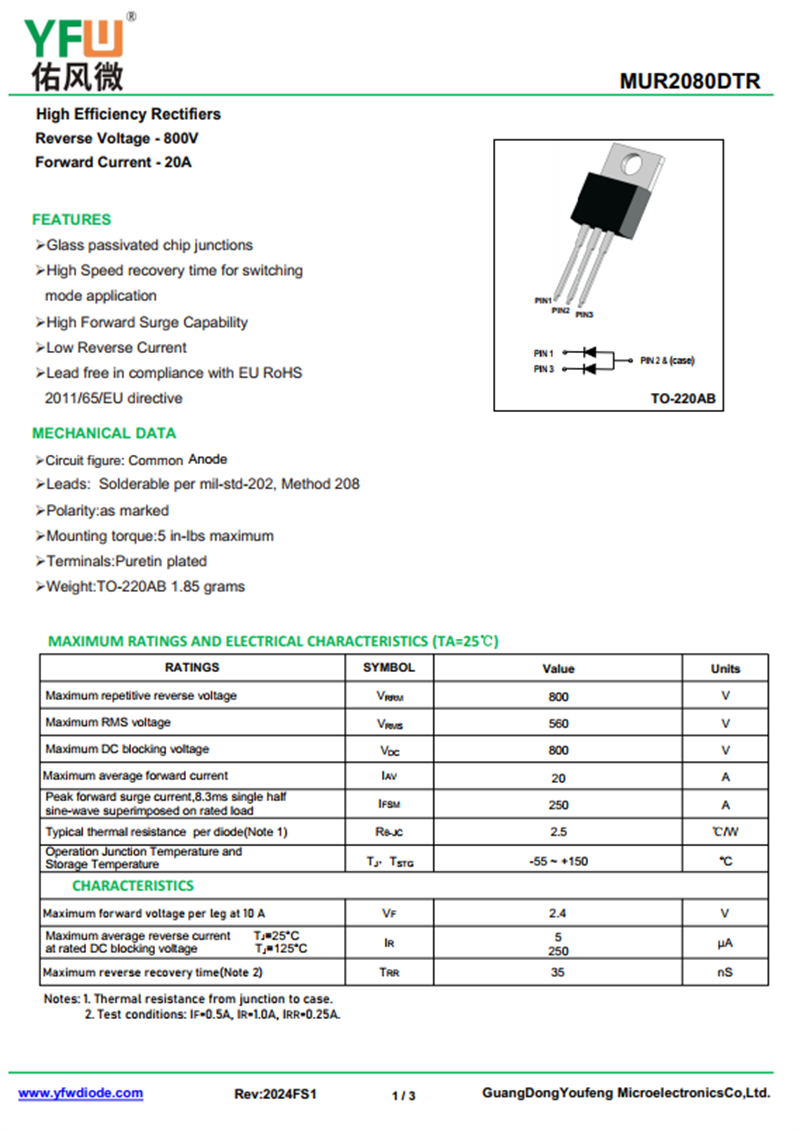 高效率整流二極管MUR2080DTR 規格書_價格_PDF手冊-廣東佑風微原廠MUR2080DTR TO-220AB_(YFW佑風微)品牌